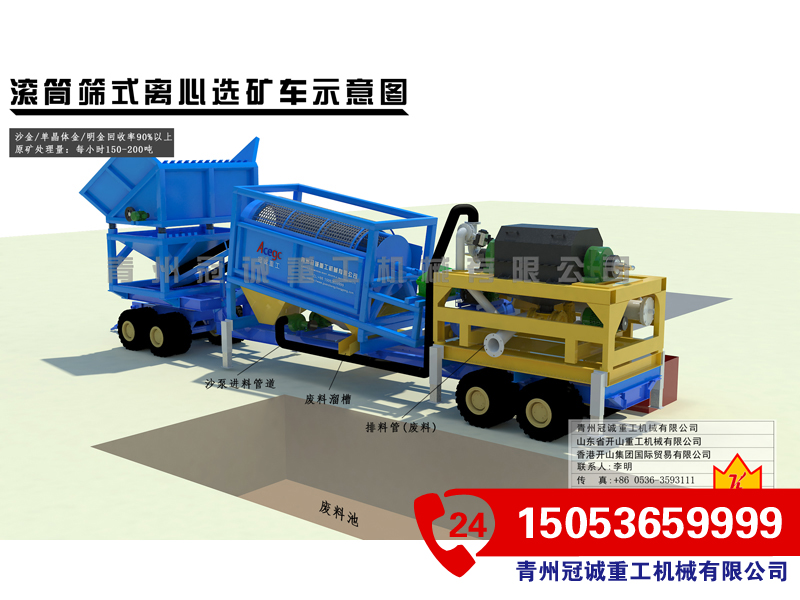 流程概述 原料通過工程機械送入振動料倉,通過上料輸送機均勻送入滾筒篩內進行篩選分級為:廢料、粗料與細料三種規格,其中廢料直接通過廢料溜槽排入廢料池中; 粗料通過溜槽排入一臺振動溜槽進行收尾后,廢料排入廢料池中; 細料通過1臺沙泵打入一臺1200#臥式全自動連續排礦離心機內進行精選,精選出的精料通過排料管道自動排入盛料箱中,廢料通過廢料管道排入廢料池中。