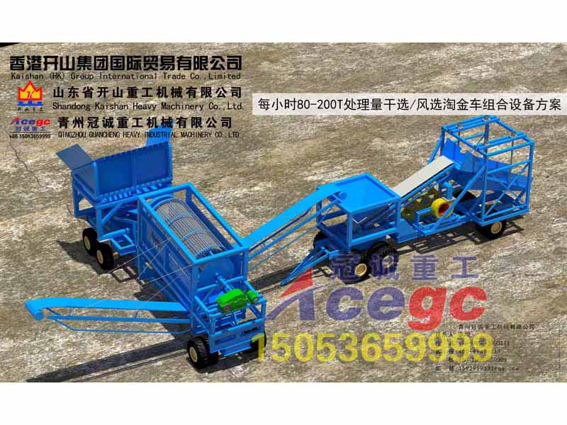 小于8MM的物料由輸送機送入一臺風選金淘金車進行風力精選,將含金礦料留在搖床內部,不含金的廢料排出至廢料區域;